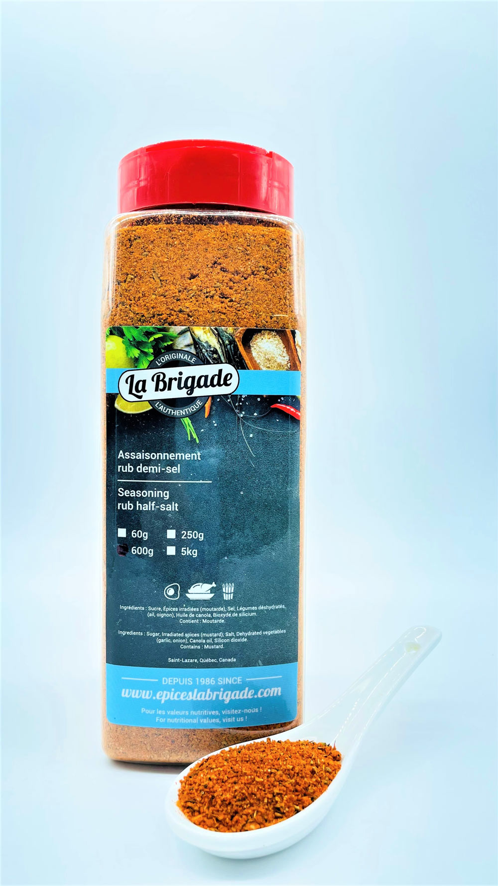 Ingredients: Sugar, Irradiated spices (mustard), Salt, Dehydrated vegetables (garlic, onion), Canola oil, Silicon dioxide. Contains:Mustard.